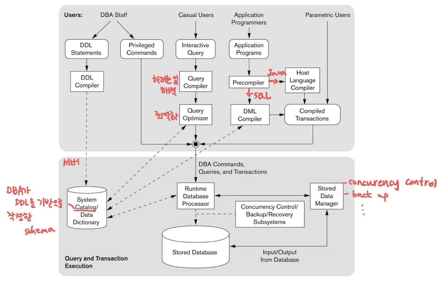 DBA가 DDL 기반으로 작성한 schema를 바탕으로 Query나 DML을 수행한다.