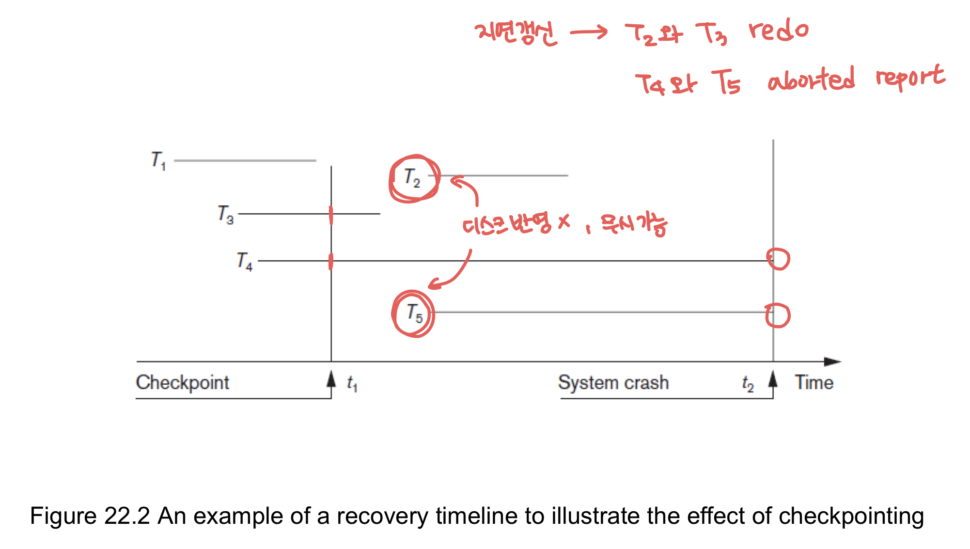 모든 transaction의 실행을 미루고 Force-write all main memory buffer한다.